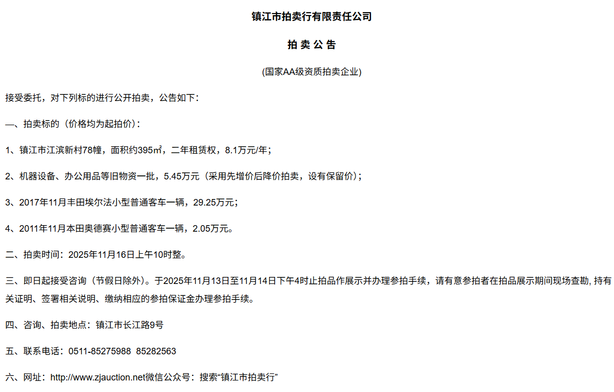 鎮江市拍賣行有限責任公司拍 租 公 吿(國家AA級資質拍賣企業)接受委托,對下列標的進行公開拍租(三拍),公告如下:—、拍租標的(以下價格均為半年至3年租賃權起拍價):1.  建行揚中豐裕支行營業網點二、三、四層經營用房(揚中市三茅鎮三豐南路5號),租賃面積約1080㎡,每層面積約360㎡,三拍底價11.98萬/年(0.3元/平方米/天)。2.  建行揚中油坊支行營業網點三、四層經營用房(揚中市油坊鎮太陽路129號),租賃面積約590㎡,每層面積約295㎡,三拍底價5.34萬/年(0.25元/平方米/天)。3. 建行揚中八橋支行營業網點三、四層經營用房(揚中市八橋鎮太平北路29號),租賃  面積約400㎡,三層約185㎡,四層約215㎡,三拍底價4.43萬/年(0.25元/平方米/天)。以上3套房產均可分層部分出租,拍租價=拍租面積*每平方米每天的租賃單價4. 建行鎮江團山路支行營業網點一層經營用房(鎮江市檀山路8號60幢102、103室),租賃面積約597.09㎡,三拍底價34.52萬/年。5. 建行丹陽原賢橋分理處營業用房(丹陽市城河路15-21號),租賃面積約93.88㎡,二拍底價7.16萬/年。二、拍租時間:2025年11月23日上午10時整。三、即日起接受咨詢(節假日除外)。于11月17日至11月21日下午4時止拍品作展示并辦理參拍手續,請有意參拍者在拍品展示期間現場查勘,持有關證明、簽署相關說明、繳納相應的參拍保證金辦理參拍手續。四、咨詢、拍租地點:鎮江市長江路9號五、聯系方式:0511-85275988   13655299933楊先生六、網址:http://www_zjauction_net.jiangsuhengxi.com;微信公眾號:搜索“鎮江市拍賣行” 拍品清單2025.11.23序號名稱起拍價(元)標的說明1建行揚中豐裕支行營業網點二、三、四層經營用房(揚中市三茅鎮三豐南路5號),租賃面積約1080㎡,每層面積約360㎡三拍底價11.98萬/年(0.3元/平方米/天)1、1-3號房產均可分層部分出租,拍租價=拍租面積*每平方米每天的租賃單價;2、意向競拍人在拍賣前需持營業執照或身份證與委托方說明租賃房產經營業態,確定意向后出具房產承租用途承諾書,經委托方審核后,方可交納保證金參加競拍;3、租賃期限為半年至3年(承租方與出租方協商而定),承租方每半年或一年結付租金,租賃期間的水、電費用及其它相關費用均由承租方承擔;4、承租方不得用于經營和保管危險物品,不得用于開設餐飲、娛樂等可能嚴重影響消防安全、運營安全的經營業態,不得用于經營委托貸款、小額貸款等可能冒用委托方名義,帶來聲譽風險的經營業態。租賃期內,承租方不得破壞墻體結構,自行成就消防、安全等使用條件,不得擅自將租賃房屋轉租、轉讓給他人使用,否則委托方有權收回房屋;5、拍租成交后,承租方將租金交至出租方指定賬戶,傭金交至拍賣方賬戶(拍租傭金為該房屋一個月租金)。承租方憑租賃合同無息退還保證金。2建行揚中油坊支行營業網點三、四層經營用房(揚中市油坊鎮太陽路129號),租賃面積約590㎡,每層面積約295㎡三拍底價5.34萬/年(0.25元/平方米/天)3建行揚中八橋支行營業網點三、四層經營用房(揚中市八橋鎮太平北路29號),租賃面積約490㎡,每層面積約245㎡三拍底價4.43萬/年(0.25元/平方米/天)4建行鎮江團山路支行營業網點一層經營用房(鎮江市檀山路8號60幢102、103室),建筑面積約597.09㎡三拍底價34.52萬/年5建行丹陽原賢橋分理處營業用房(丹陽市城河路15-21號),建筑面積約93.88㎡二拍底價7.16萬/年